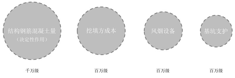 結論2:造價組成,相比于傳統(tǒng)車庫,專利車庫大大降低了鋼筋混凝土、挖填方、風煙設備等成本,省投資。